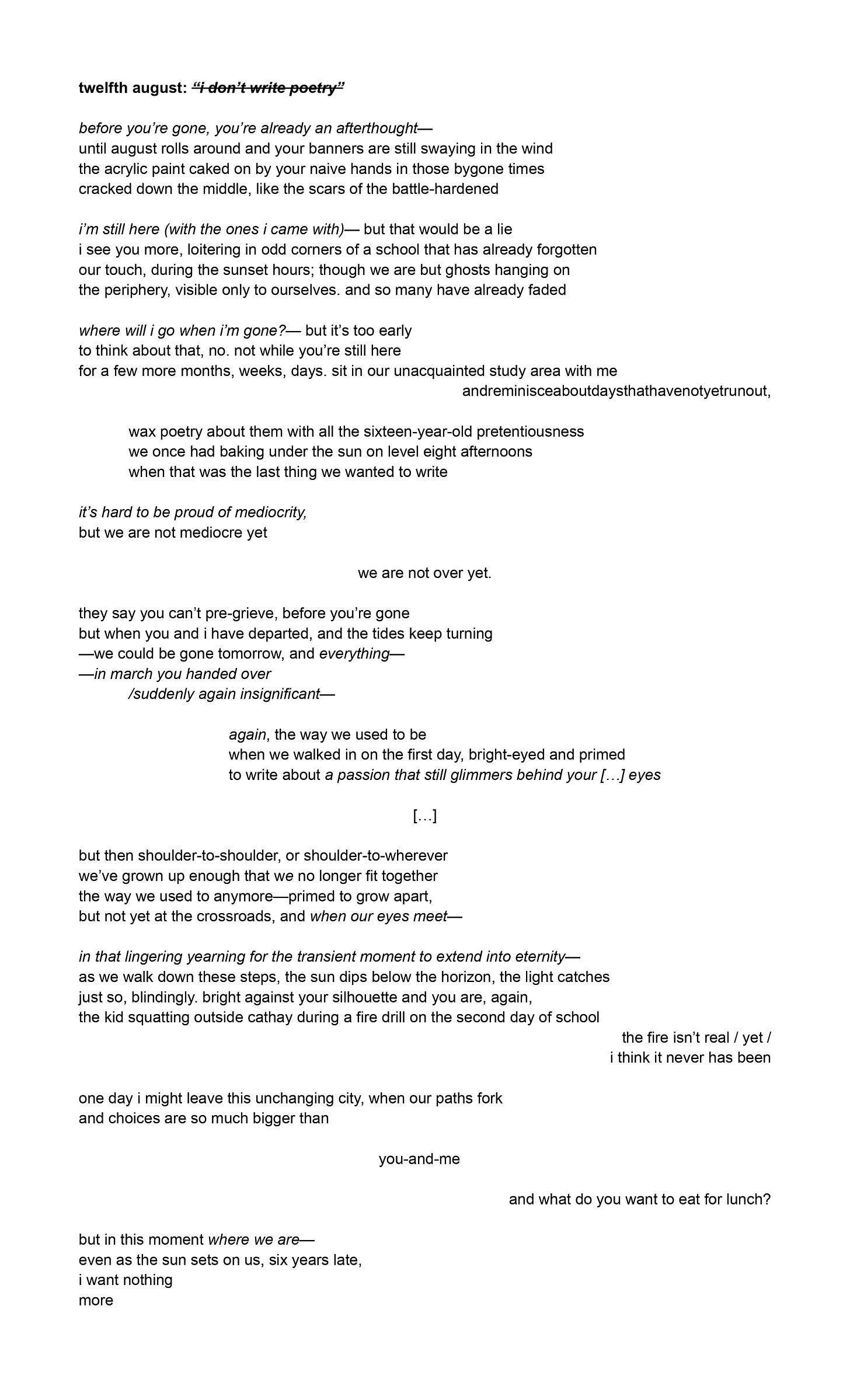 Earlier this year, Julian submitted a poem to PubliCASion that shares a title with this post. Eight months later, in August, I submitted my response to it. twelfth august is also my response to many other words, people and places that I have encountered in the past two years, and it is a love letter to them too.